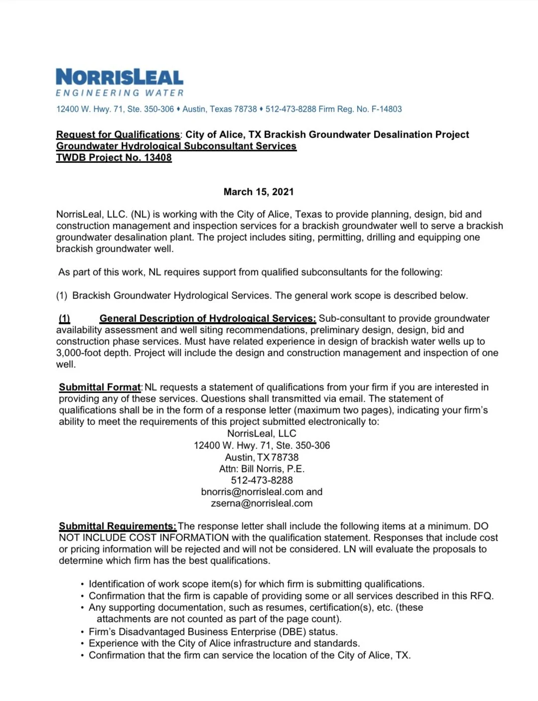 Request for Qualifications: City of Alice, TX Brackish Groundwater Desalination Project Groundwater Hydrological Subconsultant Services TWDB Project No. 13408